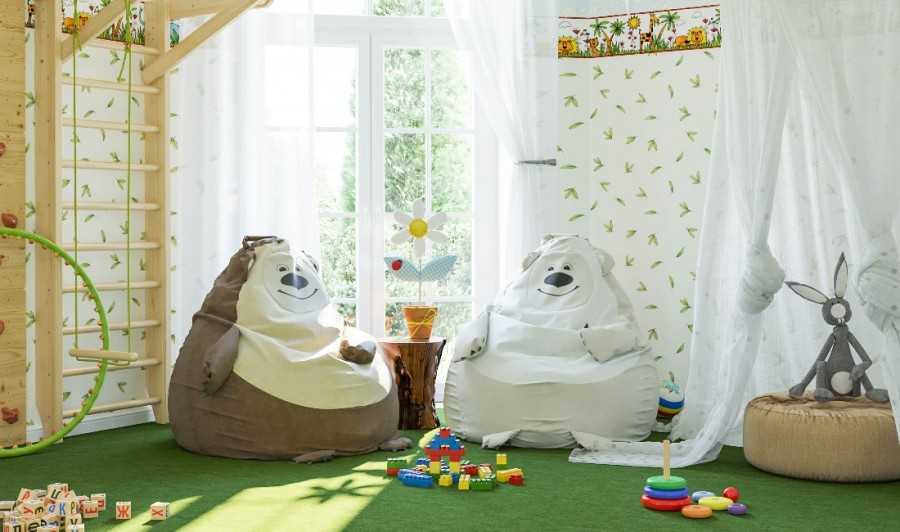 Для детской комнаты отличным решением станут кресла в виде зверей или разноцветная «груша». Бин — бэг идеально подходит для детской ввиду своей экологичности и безопасности, так как острые углы, о которые может пораниться ребёнок, у бескаркасной мебели отсутствуют.