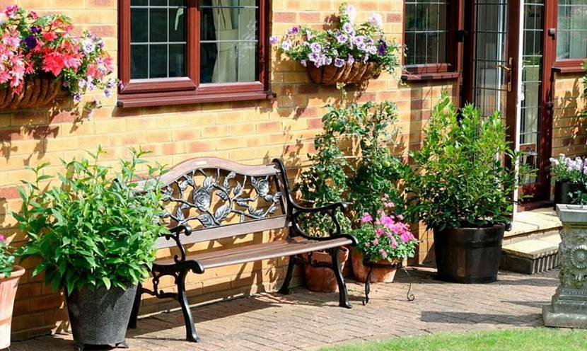 С клумбой. Садоводы-любители неравнодушны к мебели, в опоры которой встроены цветочные ящики или вазоны. Композиция органично вписывается в любое окружение и одновременно позволяет хозяевам продемонстрировать своё хобби.