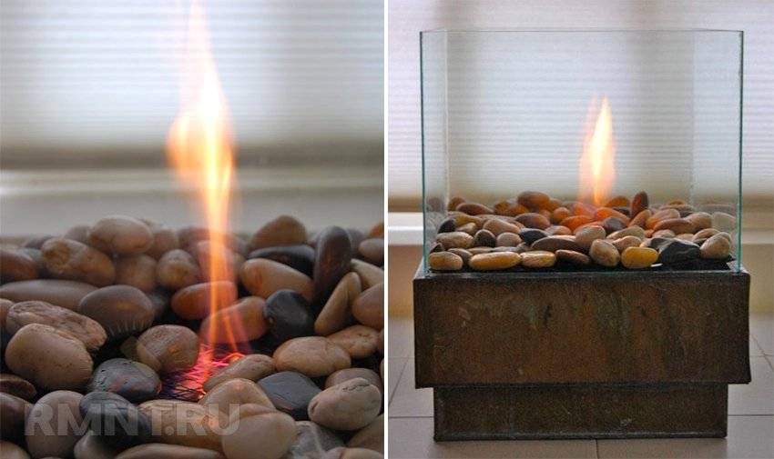 Как было сказано выше, биокамин на жидком топливе — спиртовая пиролизная горелка. Всё, что нам нужно будет сделать, чтобы получить комнатный безопасный источник огня — это организовать все элементы в декоративном виде. Мы опишем метод создания настольного переносного биокамина, на основе принципа работы которого можно создать и стационарный очаг.