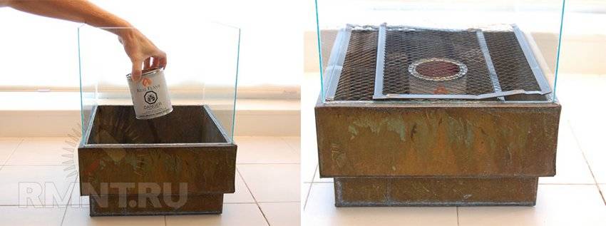 На данном этапе «камин» уже можно использовать. Для этого нужно установить ёмкость с топливом в короб основания, погрузить фитиль и продеть его через решётку. Саму решётку установить на планки короба основания, сверху положить красивые камни и прижать ими фитиль. В итоге получится пламя, которое пробивается сквозь камни.