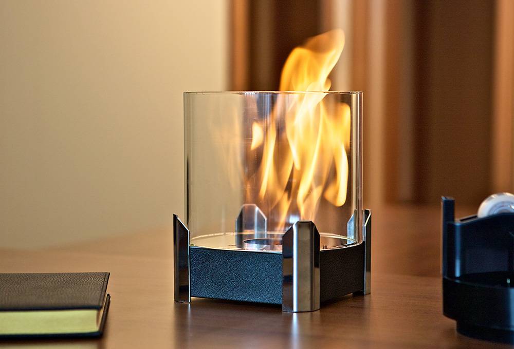 Такая компоновка даёт максимальную близость к огню, что негативно сказывается на пожарной безопасности изделия. Практически все настольные камины имеют одну общую деталь — «колодец» со светопрозрачными стенками в виде колбы или трубы прямоугольного сечения.