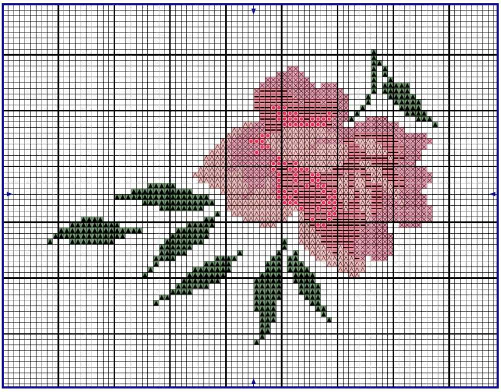 Далее дана схема вышивки розы крестиком в двух вариантах: цветная и техническая черно-белая. Схемы можно скачать или пользоваться онлайн.