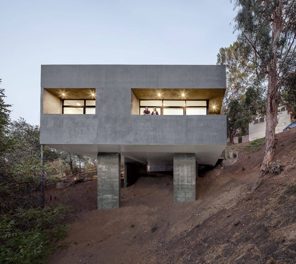 Это привело клиентов и архитектора к вершине очень крутого склона, подверженного воздействию ветра, но с захватывающим дух видом. Дом имеет прозрачный горизонтальный объем, размещенный поверх бетонной несущей конструкции. Это создает впечатление дома, плавающего над ландшафтом.