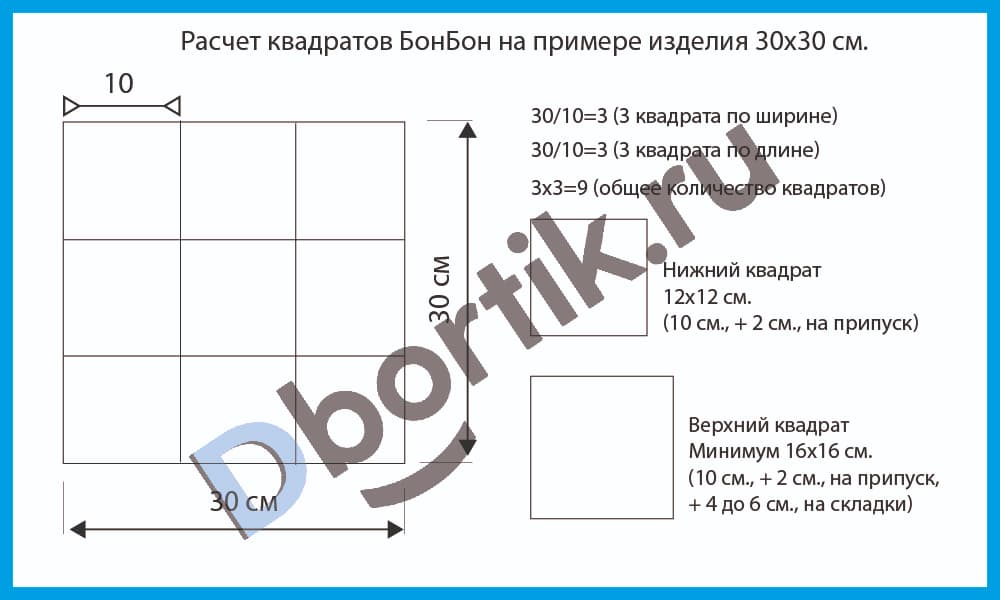 Размер верхнего квадрата – к размеру нижнего квадрата (10 см.,) прибавляем 2 см., на припуски и 4-6 см., на складки, т.е. минимум размер верхнего квадрата будет 16×16 см., чем больше будет припуск на складки, тем выше и пышнее будет бомбон.