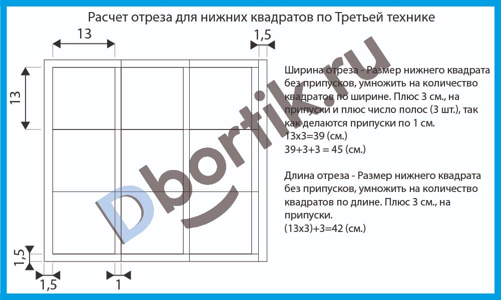 Ширина отреза – Размер нижнего квадрата без припусков, умножить на количество квадратов по ширине. Плюс 3 см., на припуски и плюс число полос (3 шт.), так как делаются припуски по 1 см. 13х3=39 (см.) 39+3+3 = 45 (см.)