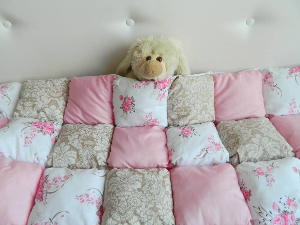 Совет! Можно нашивать весь массив верхней ткани сразу. После завершения с изнаночной стороны на каждой подушке нужно сделать надрез и поместить через него наполнитель, далее зашить вручную. Разрезанные края следует заворачивать вовнутрь, чтобы они не осыпались в процессе использования.