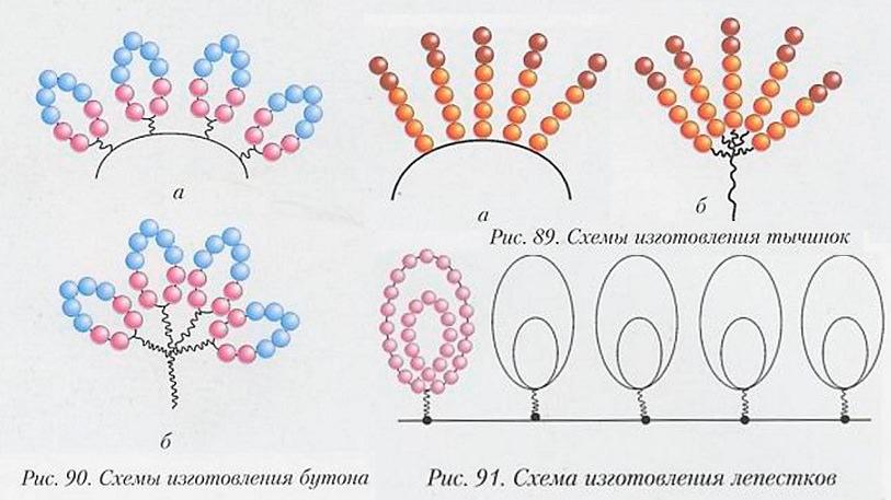 Конечно, Вы можете попытаться сделать более сложные варианты, в которых каждый цветок и листочек плетется по отдельным схемам, отдельно нанизываются лепесточки, которые крепятся к сердцевинке и т.д. Но это уже следующий этап.