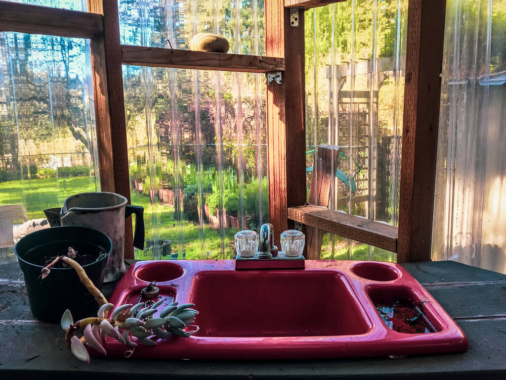 Фото яркой раковины на бордовой кухне.
