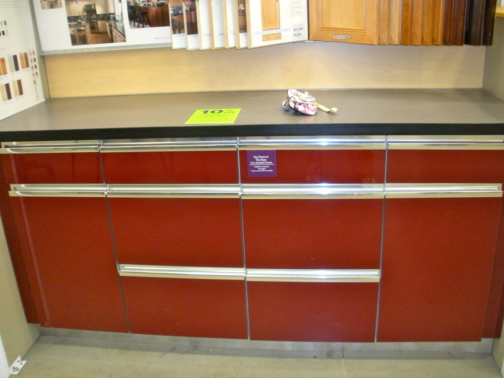 Не стоит покупать гарнитур бордового цвета в небольшую кухню. Бордовый можно использовать при обустройстве пола — в качестве материала подойдет ламинат, плитка, керамогранит, это может быть и глянцевый наливной пол.