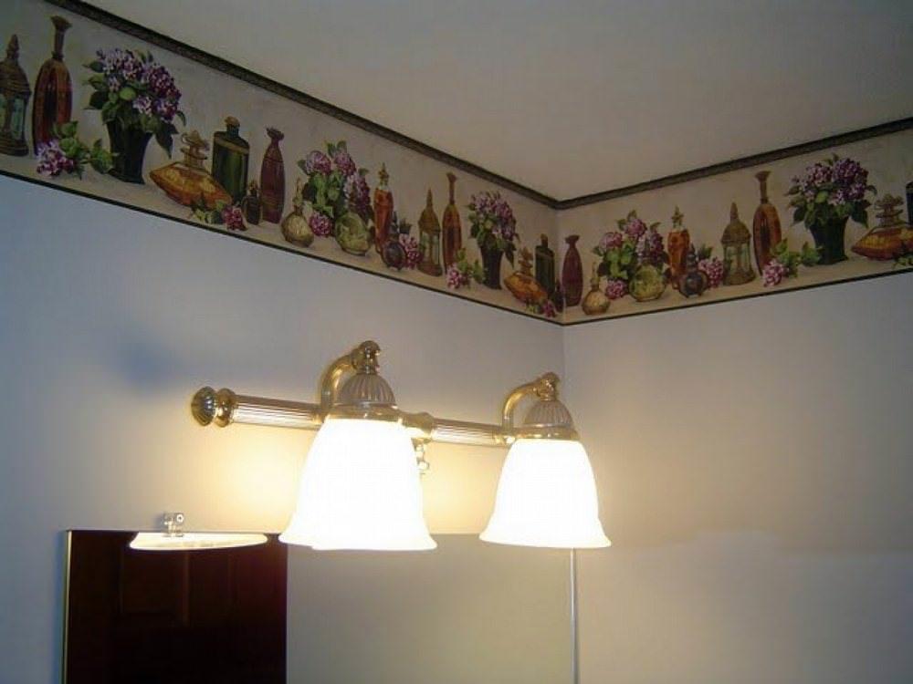 Чтобы скрыть неудачную подрезку обоев или спровоцировать гостей обратить внимание на ваш шикарный натяжной потолок или изысканный светильник, расположите бордюрную ленту прямо под потолком. Более заметной будет широкая лента. Вариантов таких бордюров очень много, иногда они могут быть выполнены в виде крупных цветов, необычных птиц или надписей