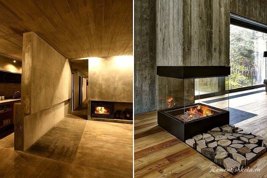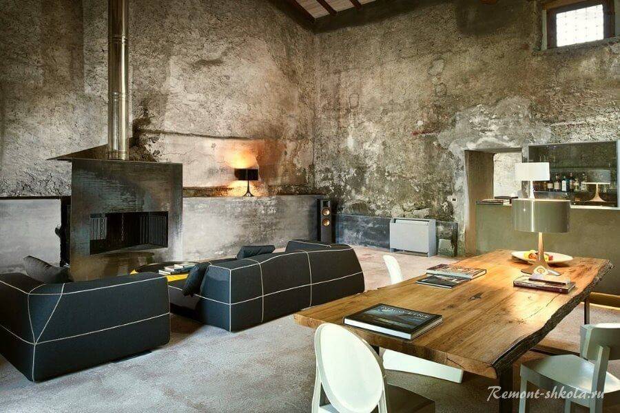 Необработанный бетон, дерево, стекло и металл. Штукатурка и дерево естественного цвета, можно покрыть разве что бесцветным лаком – естественность в приоритете. Пол наливной, покрыт плиткой или массивом дерева. В отделке стен “номер один” – неотесанный бетон.