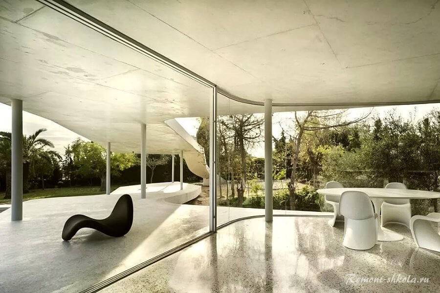 Плавные и скругленные линии в интерьере опенспейса частного дома