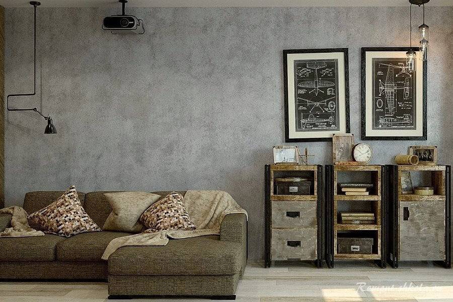 Здесь всё без сюрпризов – сурово и функционально. Мебель простая, удобная, без излишеств. Формы прямоугольные, материалы натуральные – кожа, мешковина, металл. Часто фурнитура не прячется, а выступает декором. Диван, ванная, раковина, полки — всё стоит на ножках. Так под мебелью будет пространство, она будет не такой громоздкой.