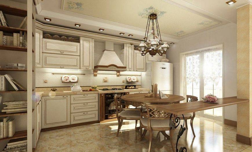 Сам потолок может быть также отделан простым белым гипсокартоном, оштукатуренным или матовым, а также цветным. Отличным решением для кухни с высокими потолками было бы нарисовать на них рисунок, имитирующий старинные фрески. Подобные изображения могут быть напечатаны на натяжном потолке, визуально полностью создавая эффект фрески.