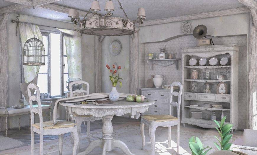 Составляющие для таких интерьеров приобретались на барахолках, старую мебель реставрировали и дополняли соответствующими деталями, таким образом, создавалась потертая элегантность в отделке помещений. В комнатах, оформленных в таком стиле, царила романтичная, комфортабельная и уютная атмосфера.