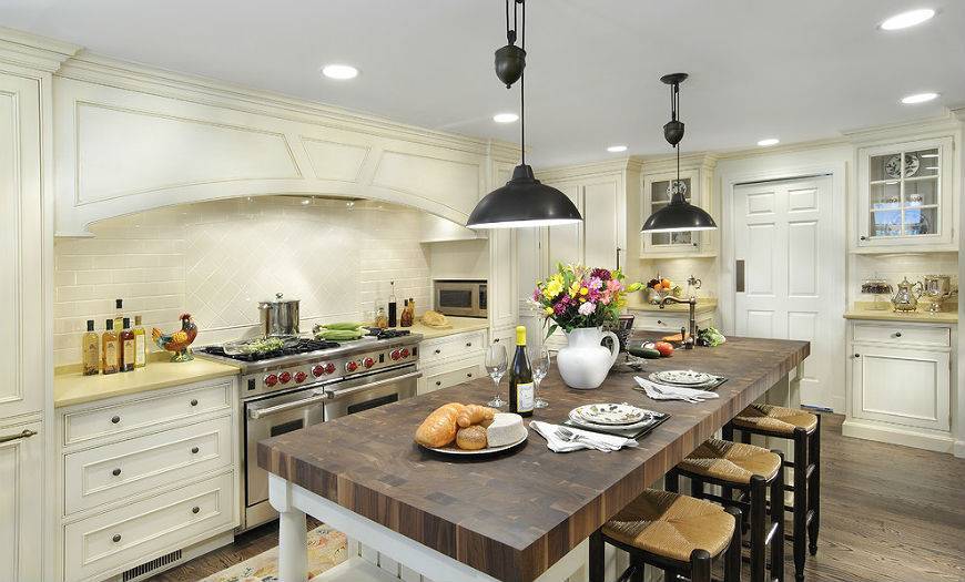 Кстати, люстру лучше вешать не в центре кухни, а прямо над обеденным столом. Так столовая зона визуально отделится от рабочей и станет по-настоящему парадной.