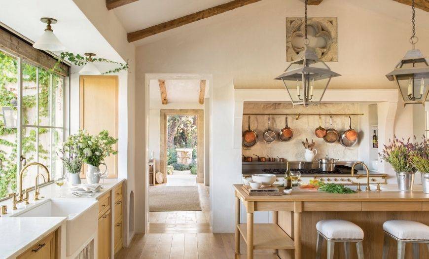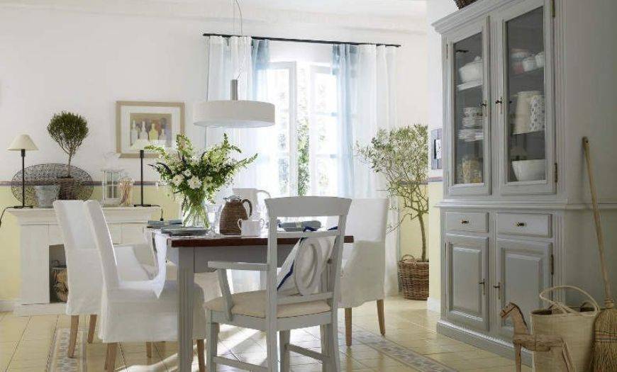 Мебель следует использовать в светлых тонах, но будет лучше, если кухонные столешницы останутся деревянными. Если у вас есть фарфор, который вы унаследовали от бабушки, не забудьте показать его. Благодаря этому, он станет не только полезным кухонным оборудованием, но и отличным украшением. Что еще нельзя пропустить: