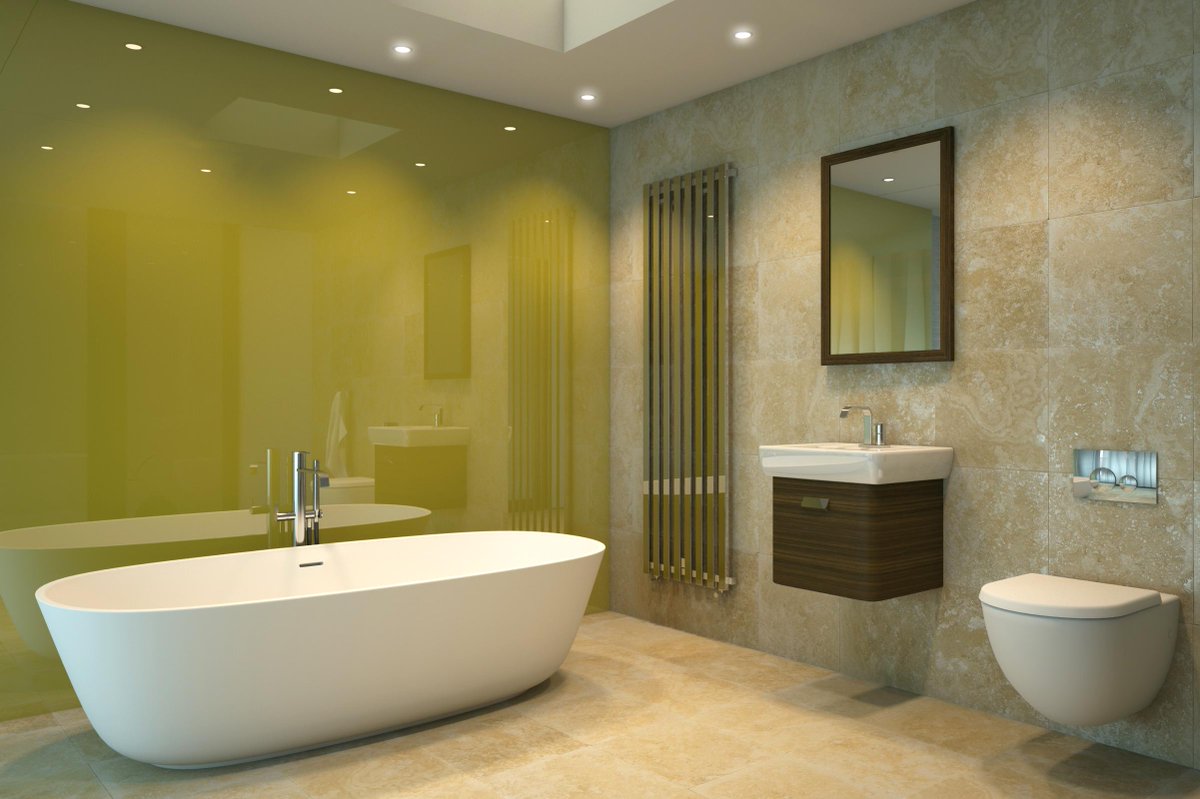 Крупноформатные стеклянные панели в интерьере ванной современного стиля