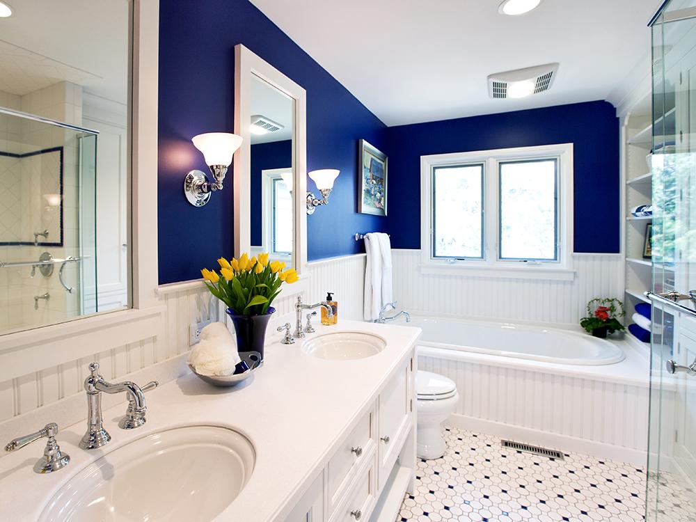 Конечно, далеко не каждая краска найдет свое идеальное применение в стенах вашей ванной комнаты. Ориентироваться следует на водостойкие вариант на базе латекса или акрила. Как правило, в них содержатся активные вещества, которые препятствуют появлению плесени и грибка. Правда, имеющие прямой контакт с водой участки — например, в зоне душа, умывальника — оптимальнее всего прикрыть закаленным стеклом. Ведь какова бы ни была водостойкой краска, срок ее службы неумолимо сокращается вследствие постоянного соприкосновения с водяными каплями. Вот мы и затронули основные минусы данного материала: