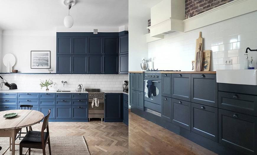 Еще одним оригинальным трендом сейчас стали интересные оттенки синего. Многие покупатели выбирают модели такой окраски. Притом в синем тоне может быть выполнен или весь гарнитур, или только отдельные его детали
