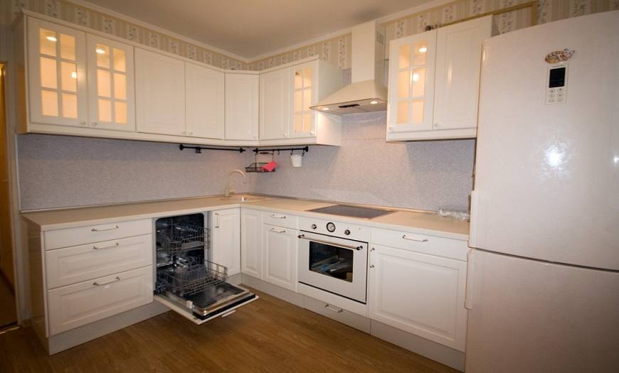 Расстановка кухонной мебели буквой “Г” наиболее практична с точки зрения эргономики. Она позволяет выделить полноценную обеденную зону, установить всю необходимую бытовую технику, уменьшить расстояние между функциональными блоками.