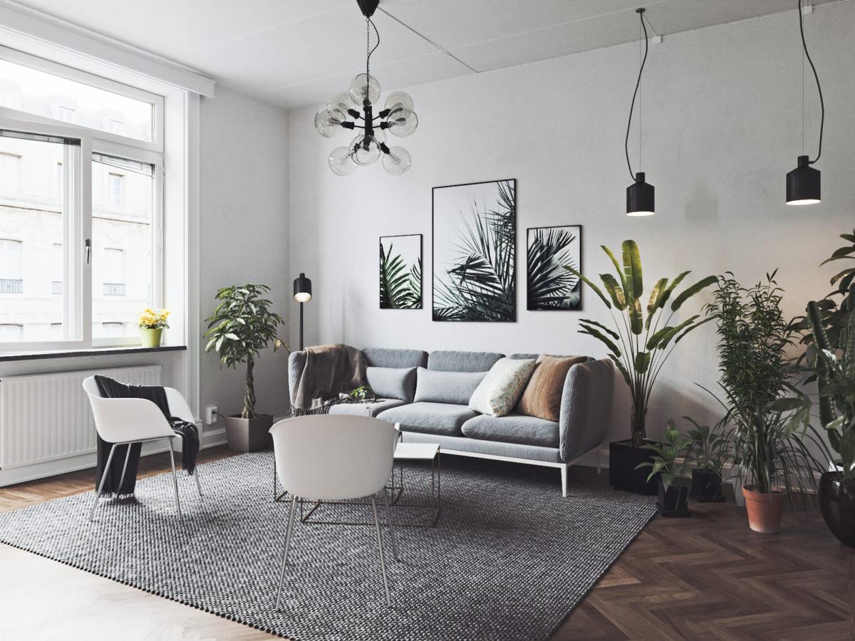 Любители зелёных насаждений могут поставить на пол 1–2 кадки с крупными растениями: фикусом, монстерой, гибискусом. Они могут располагаться в не очень удобных уголках комнаты. На придиванный столик ставят вазу с живыми цветами, которые периодически меняют.