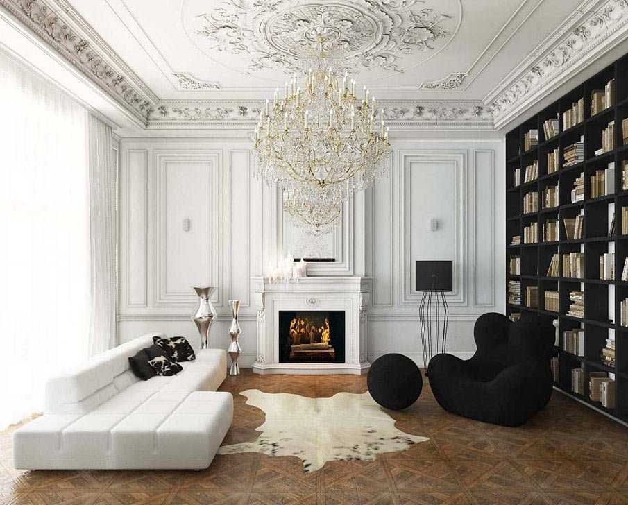 Классика – самое распространённое направление дизайна, никогда не выходящее из моды. Если понимать под классическим стилем только старинные интерьеры, то стоит сказать, что чистое сочетание чёрного и белого почти не применялось до XX века. Однако в наши дни очень популярны неоклассические интерпретации (современный дизайн на основе традиционных элементов). Именно в современных классических гостиных можно довольно часто встретить разнообразные цветовые эксперименты с простыми сочетаниями.
