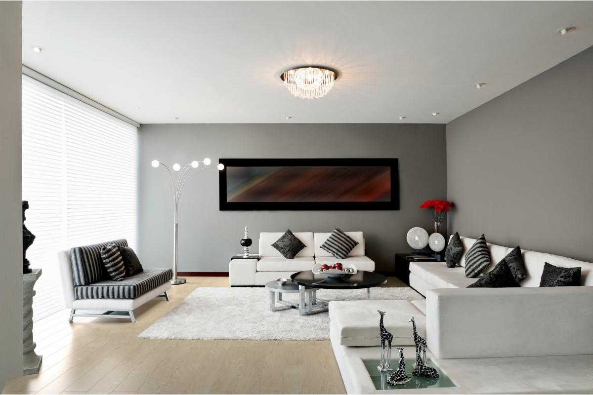 Интерьер серой гостиной требует достаточной освещённости, чтобы помещение не казалось мрачным или тусклым. Потолочное освещение, в зависимости от стилистики, может быть организовано одним из следующих способов: