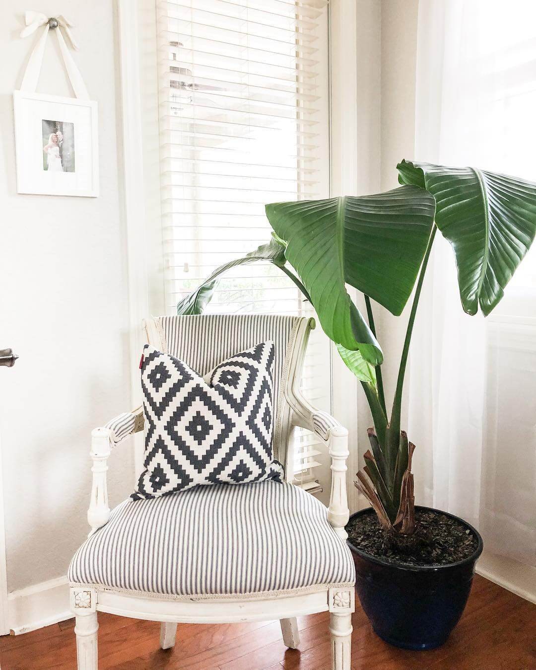 Подушка со строгим геометрическим узором – контрастное пятно в белом интерьере.
