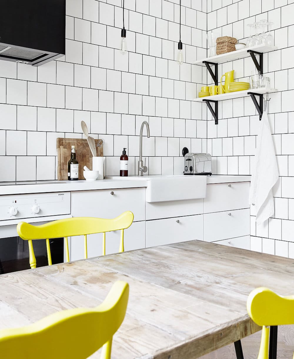 Хорошо справится с задачей разбавления гаммы желтый цвет. Его оттенки не просто делают интерьер оптимистическим и солнечным, этот цвет, как утверждают психологи, повышает аппетит. А значит, его уместнее всего использовать именно на кухне.