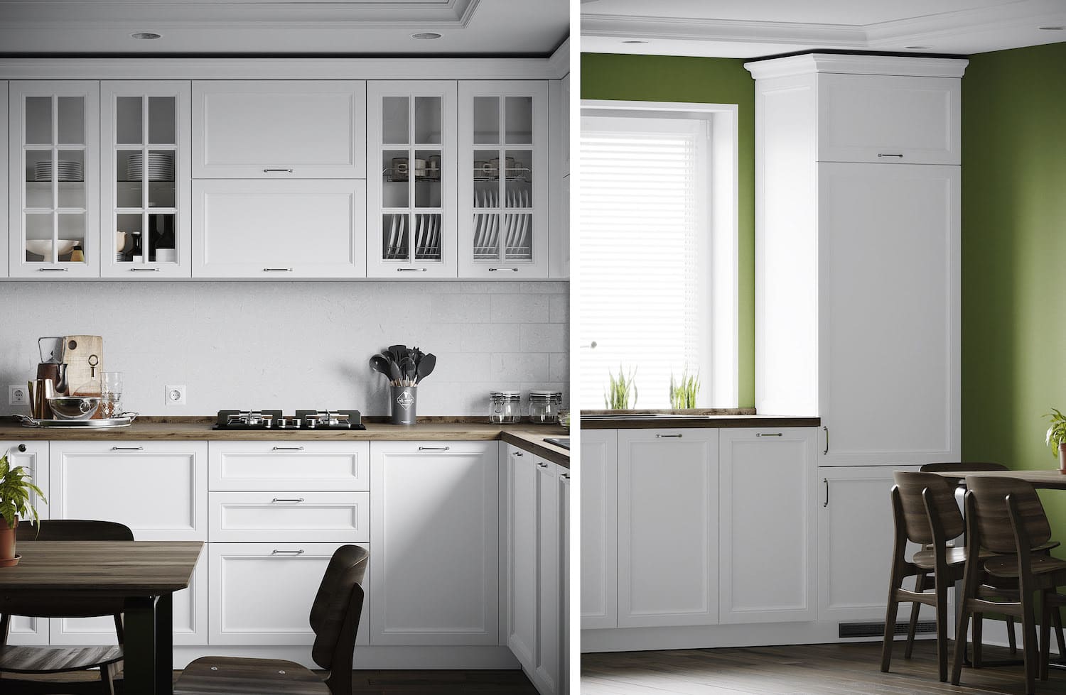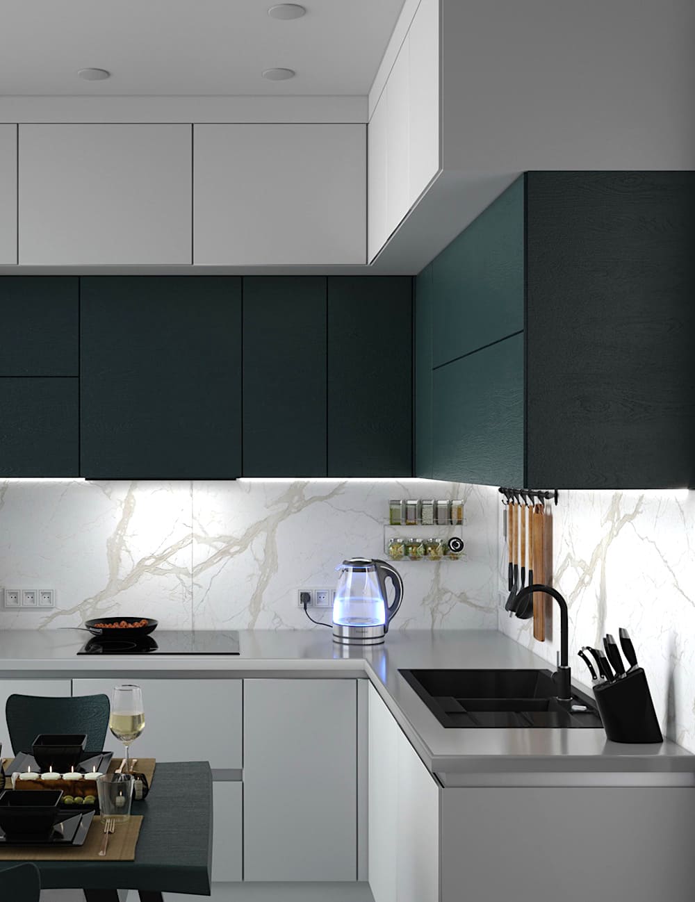 Например, на фоне белых стен нижний ряд шкафов может иметь черные фасады, а верхний – белые. В таком случае они будут сливаться со стеной, потолки станут казаться более высокими, а само помещение – более объемным.