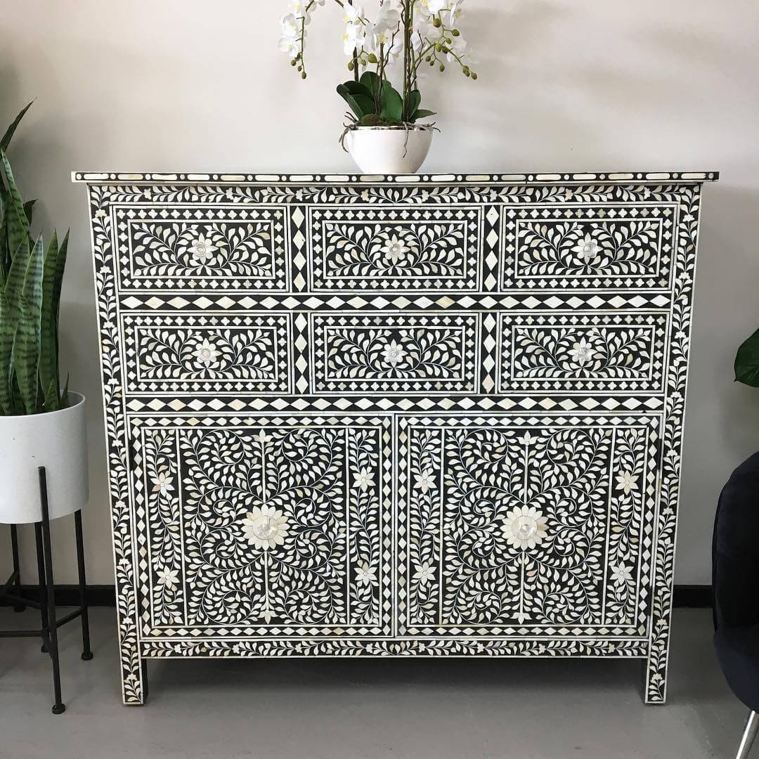 Мелкий орнамент темного комода уравновешен однотонной белой стеной.