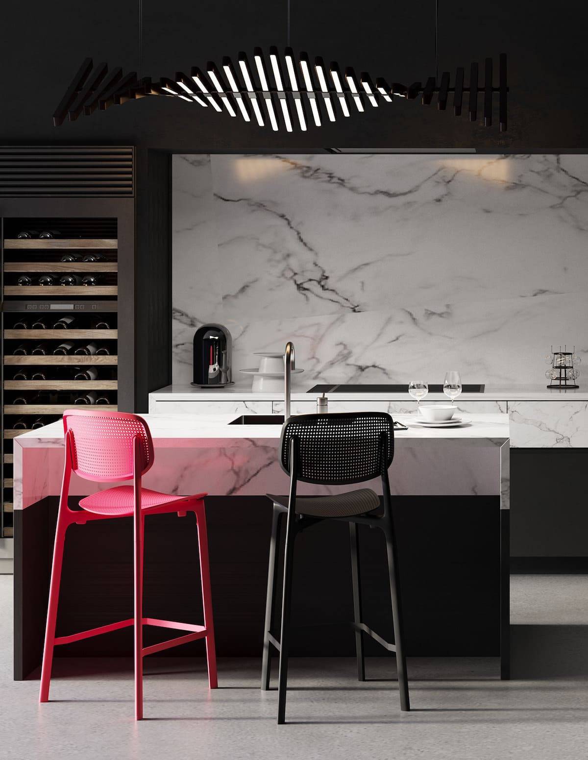 Для создания красивого дизайна черно-белой кухни 2022 с яркими акцентами, прекрасно подойдут красные детали. Использование красного в качестве третьего цвета добавит дизайну эффектности, правильной агрессии. Насыщенность и оттенок можно подобрать по собственному вкусу — фуксия, алый, малиновый.