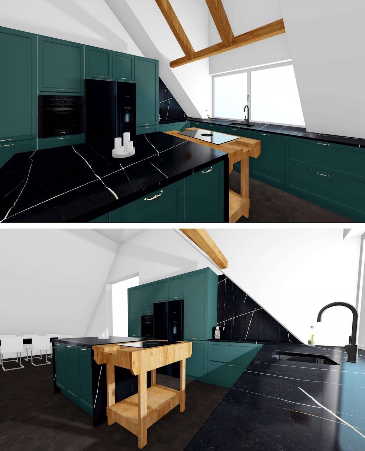 Сделать кухню в черно-белом исполнении более «вкусной» и позитивной помогут зеленые акценты. Оттенок можно выбрать любой — мятный, насыщенно-травянистый, болотный, салатовый. Цвет сделает интерьер более весенним и свежим. В качестве цветных вкраплений можно использовать зеленые шторы или жалюзи на окна и двери, гарнитур, угловой диван, стулья. Подойдут и более мелкие предметы — скатерти, светильники, посуда.