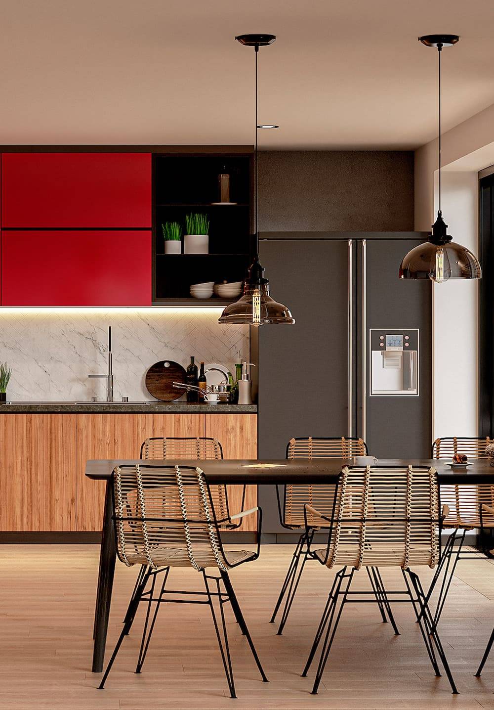 Это важно именно для красных деталей, ведь цвет сам по себе очень мощный, привлекающий внимание. Достаточно, к примеру, красных стульев, панно, светильников или узора на шкафах