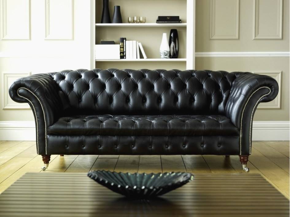 Гламурный стиль — черный диван, желательно кожаный и стеганый, является идеальным выбором для изысканного интерьера. Это может быть основой модной договоренности в черно-белом соглашении.