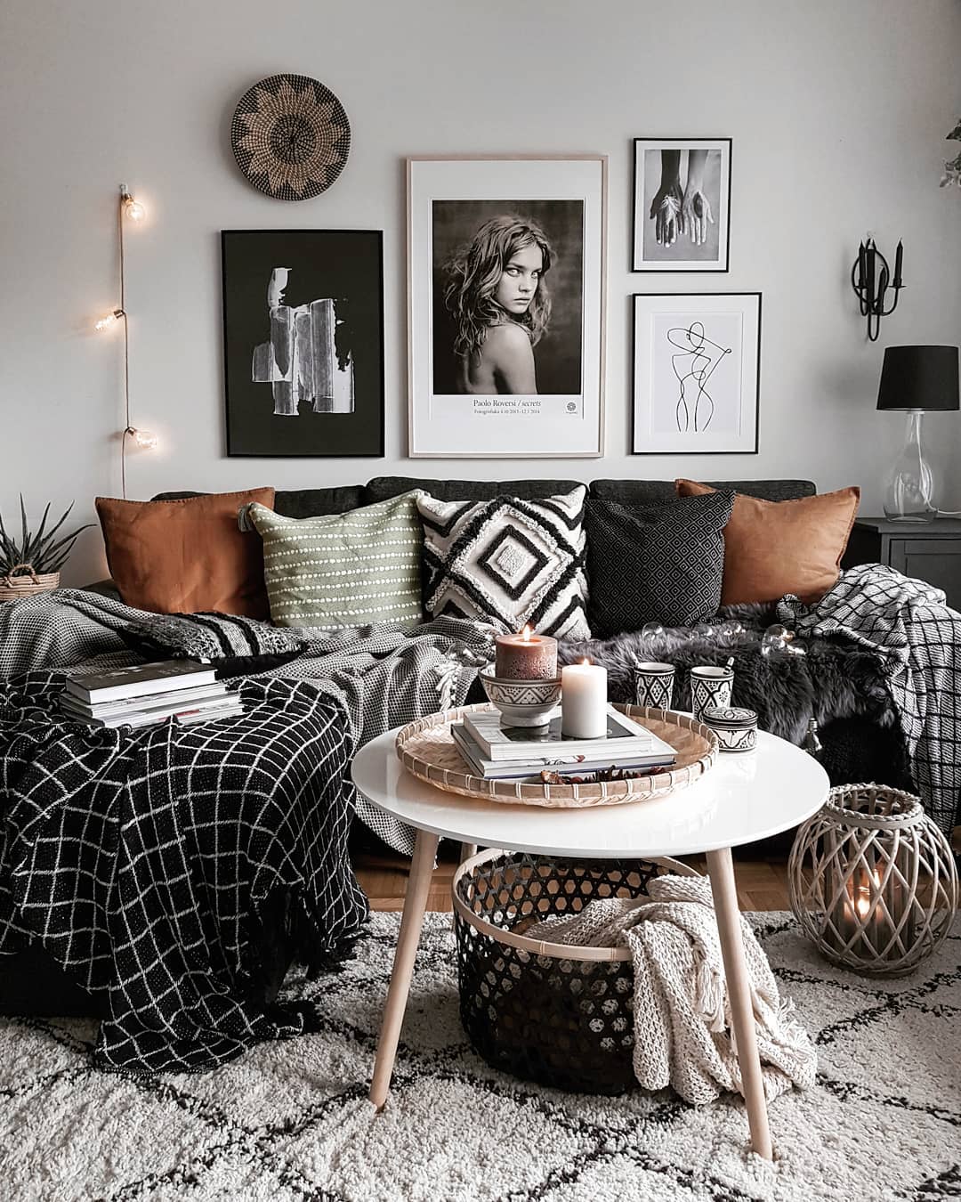 Черно-белый декор подходит для этого декоративного стиля! Независимо от темы оформления вашей гостиной, он сделает его более актуальным. В то время как черный подчеркивает различные архитектурные элементы в комнате, белый дает ему глоток свежего воздуха, делает более просторным.
