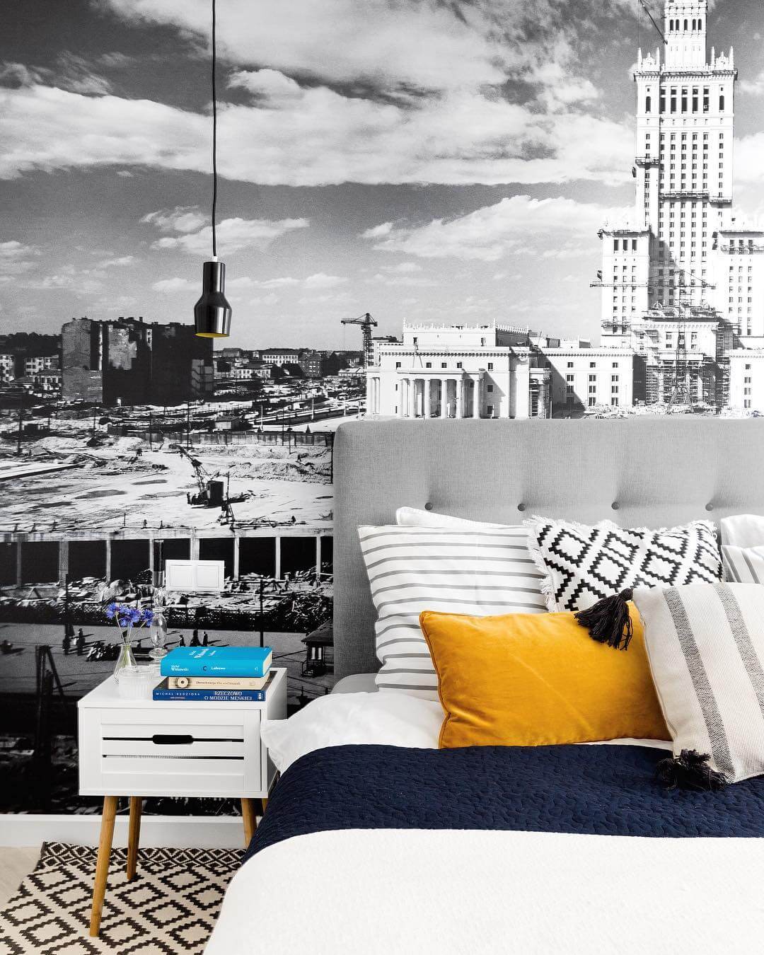 Черно-белые фотообои в интерьере спальни. Городской вид расширяет пространство комнаты.