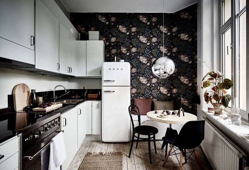 Темными обоями рекомендуется оформлять кухню в скандинавском стиле. Такие поверхности хорошо сочетаются с деревянной мебелью из светлого дерева, создавая ощущение домашнего уюта и тепла. Цвет бытовой техники в этом случае следует подбирать в тон стен. В таком интерьере с темными стенами акцент делается на антуражных элементах в виде мебели, посуды и декора, выполненного в лаконичном простоватом деревенском исполнении.