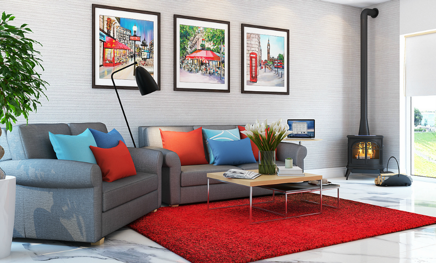 Неплохим будет сочетание красного и синего тонов на светло-сером фоне