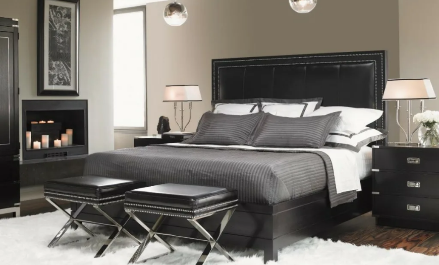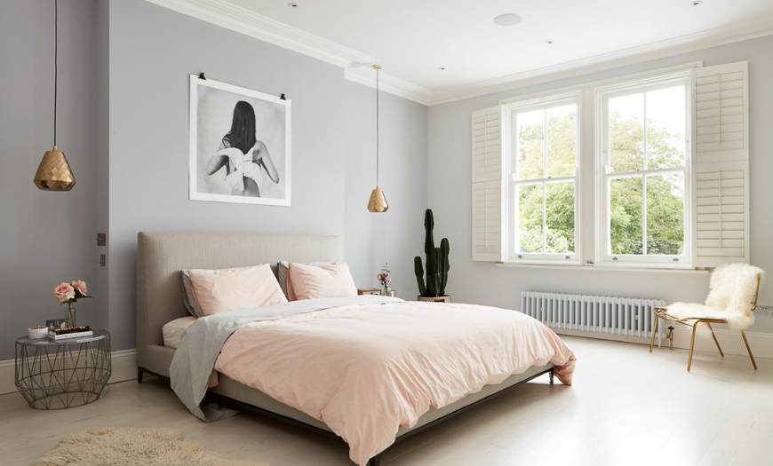 Чувственный фиолетовый и романтичный сиреневый в полной мере проявляют себя лишь в присутствии серого. Такой союз в интерьере спальни добавит страсти супружеским отношениям, помогая забыть обо всех проблемах уходящего дня. В женской опочивальне беспроигрышным вариантом станет альянс тёплых оттенков серого с приглушённым дымчато-розовым. Для брутальных мужских интерьеров уместны более тёмные – бетонные, графитовые, асфальтные тона в комбинации, например, с оттенками коричневого.