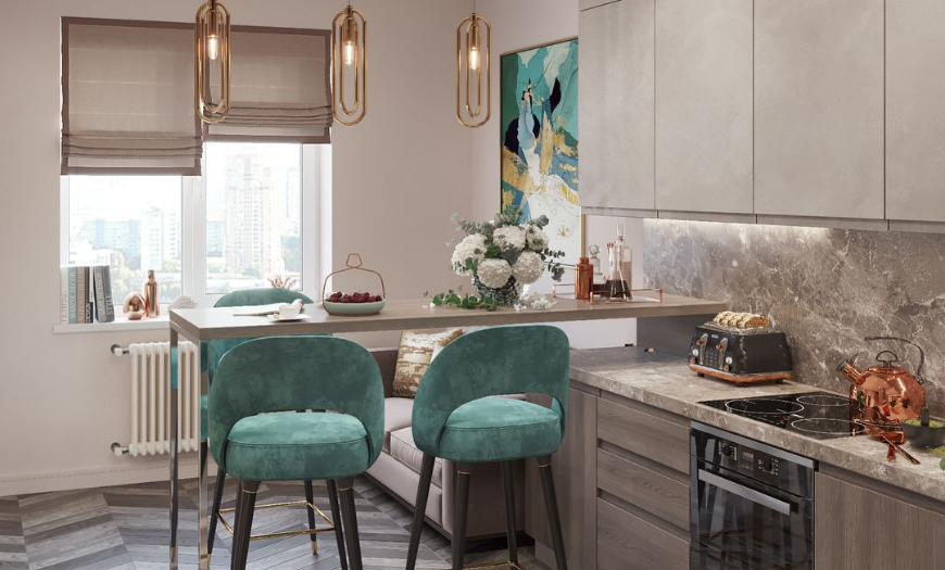 Зеленые, голубые, сиреневые оттенки делают бежевый цвет стен в интерьере кухни живым и воздушным, визуально расширяют пространство и наполняют его светом.