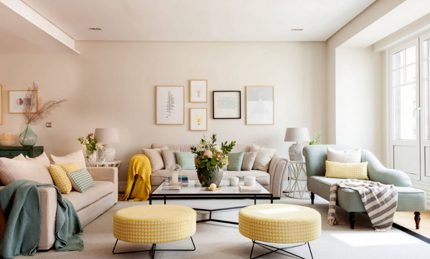 Солнечный желтый на кремовом фоне создает потрясающий праздничный интерьер