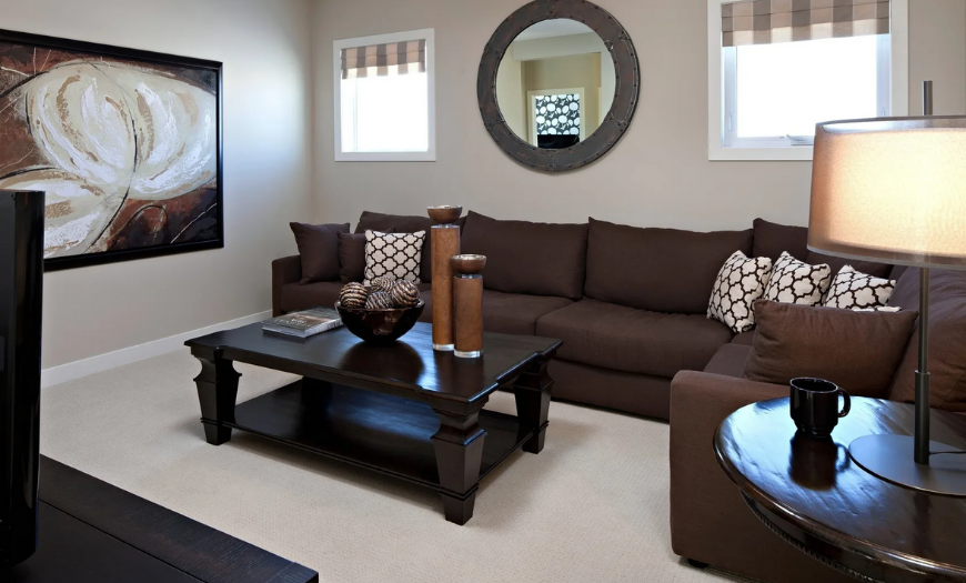 Наиболее распространенное решение – темно-коричневый, но он тоже должен сочетаться с более светлыми тонами, например, хорошо смотрится с бежевым.