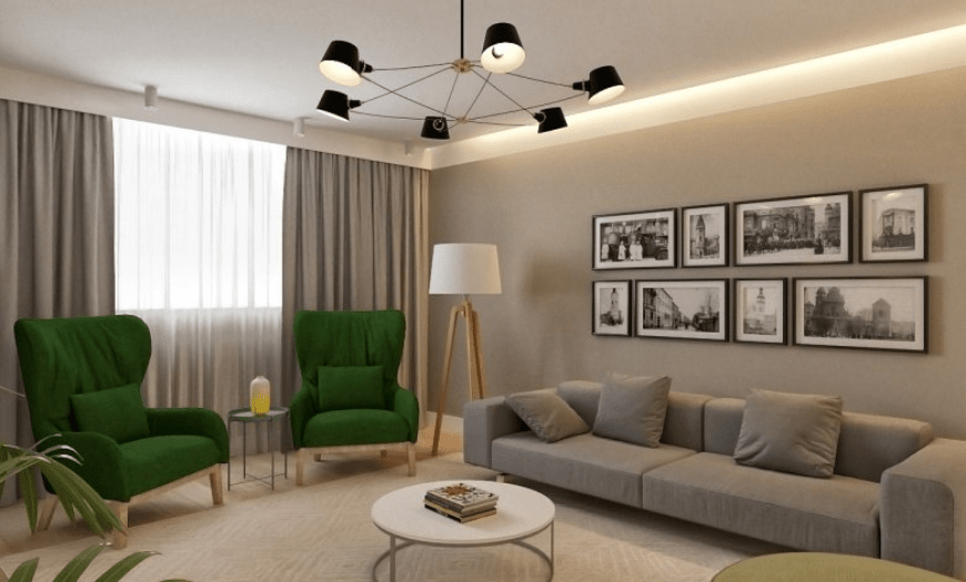 Например, в бежевой гостиной акцентными будут фиолетовые, зеленые краски, а светло-коричневый – это дополнительный оттенок, так как относится к одной базе, просто немного темнее бежевого.