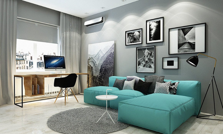 Бело — бирюзовый цвет выглядит воздушным, нежным. Это как пена на гребне морской волны. В таких цветах можно нарядно и стильно оформить обои стен, диван в спальне, покрывало и шторы в детской, обстановку ванной. Бирюза сочетается с бело — серым, получается приглушенный мягкий дизайн, помогающий расслаблению. Небольшая гостиная или кабинет и диван в нем уютно выглядит в серо – бирюзовых тонах. Сине – зелеными можно сделать шторы.