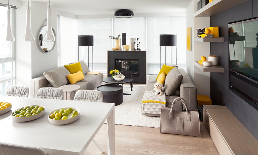 В такой комбинации, согласно советам дизайнеров по интерьеру, нужно стараться выбирать более светлые серые тона, а жёлтые и чёрные составляющие должны быть дозированными. Это правило позволяет визуально сбалансировать пространство и создать неповторимый и запоминающийся дизайн интерьера.