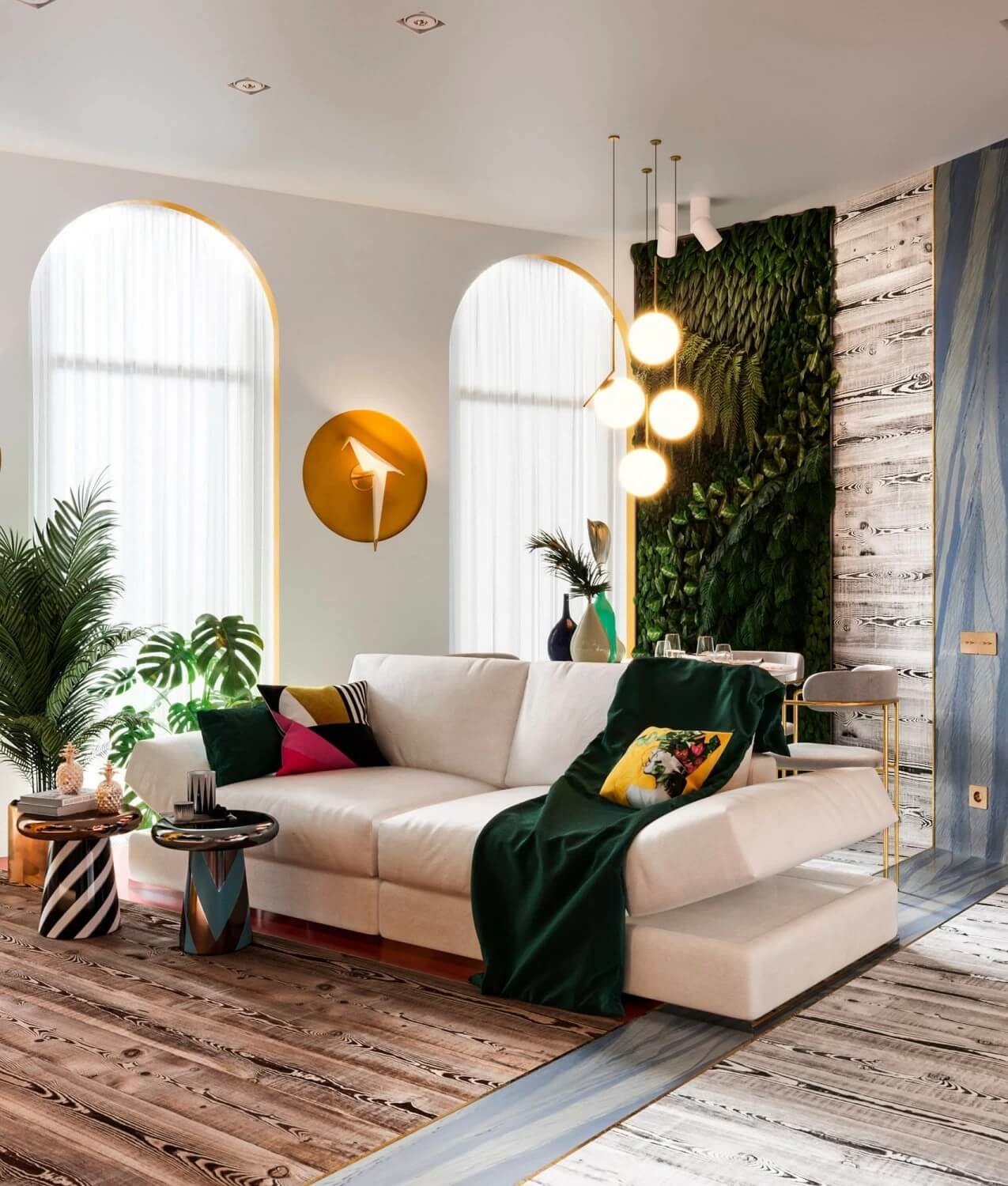 В этом проекте использовали инженерную доску, но идею из этого проекта можно взять на вооружение и соединить несколько видов ламината на полу, а также оригинально оформить стену. Проект квартиры «Яркий микс», дизайн-бюро Алёны Горской