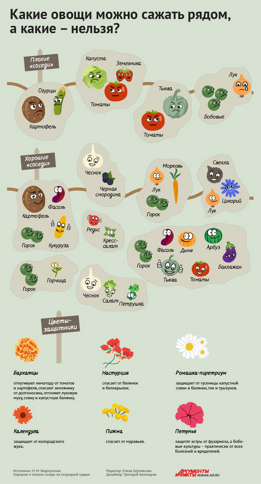 При выращивании на одном участке различных культур или сортов, между ними происходит обмен химическими соединениями и растение по соседству оказывает прямое влияние на качество и количество урожая. Прежде чем составлять план посадки овощных и ягодных культур, разберитесь, какого размещения следует избегать.