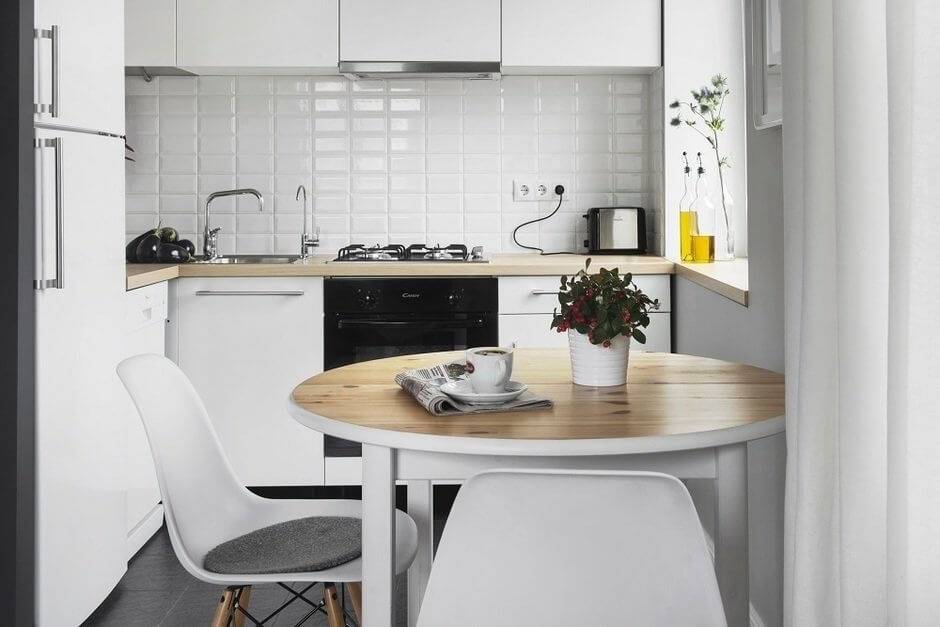 Однако аккуратные круглые и овальные столы точно также займут минимум места, если поставить их вплотную к окну, к стене или в угол. Благодаря округлой форме за ними сможет комфортно сидеть больше людей, чем за прямоугольным или квадратным столом. Кроме того, отсутствие острых углов на маленькой кухне убережет от случайных травм не только непоседливых детей, но и вечно спешащих взрослых.